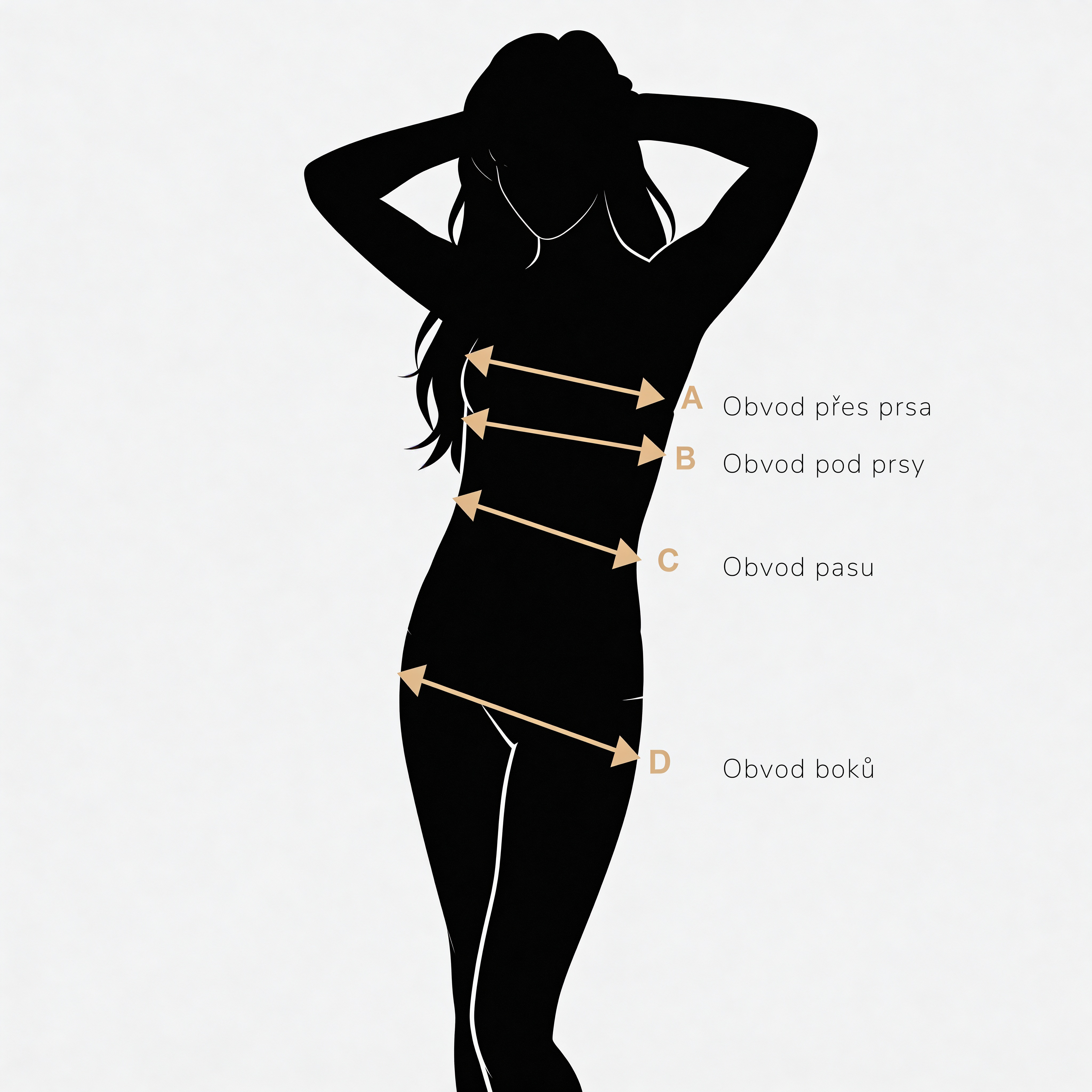 Zadejte míry v centimetrech. Obvod pod prsy měřte napevno, obvod přes prsa volněji.